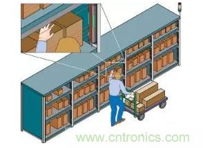 順序手動(dòng)裝配中人的準(zhǔn)確性也是防錯(cuò)的一個(gè)大問題。PLC控制的“揀選”系統(tǒng)使用指示下一個(gè)要選擇的項(xiàng)目的燈,以及每個(gè)箱前面的光幕來驗(yàn)證是否已經(jīng)采取了正確的部件。這些系統(tǒng)通過減少錯(cuò)過的零件以及以錯(cuò)誤順序組裝的零件來提高裝配操作的質(zhì)量百分比。除了裝配過程的防錯(cuò)之外,它們還通過在裝配過程中始終驗(yàn)證裝配工最后停止的位置來提高工人效率,即使在休息或停工之后也是如此。這種完全可視化的通信系統(tǒng)也是一種全球解決方案,可消除語言障礙和技術(shù)能力等培訓(xùn)障礙。該圖顯示了倉庫應(yīng)用程序。