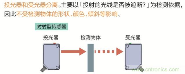 對射型光電傳感器:不受檢測物體的形狀、顏色、傾斜等影響