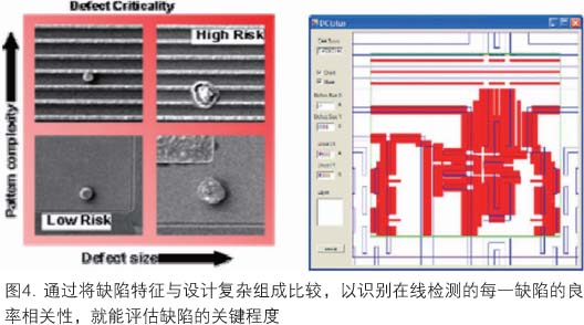 為了提高監(jiān)測(cè)和識(shí)別關(guān)鍵缺陷的效率,必須采用新方法。依賴簡(jiǎn)單的缺陷過(guò)濾和基于大小的缺陷次序是不夠的。為了取得最佳的檢測(cè)和鑒評(píng)預(yù)算,必須對(duì)檢測(cè)設(shè)置與鑒評(píng)策略二者使用新的知識(shí)信息。從設(shè)計(jì)和模擬得到的關(guān)鍵區(qū)域和熱點(diǎn)這樣一些知識(shí)信息可以插入檢測(cè)方略中,優(yōu)化可用的檢測(cè)容量。在完成檢測(cè)過(guò)程中和完成后,基于多重檢測(cè)結(jié)果的缺陷過(guò)濾和分類使用戶能快速識(shí)別新缺陷,有效地量化已知的缺陷類型。利用設(shè)計(jì)空間中缺陷鄰近位置的信息(此處,設(shè)計(jì)的復(fù)雜組成是了解的),可以較好地評(píng)估每一缺陷的良率相關(guān)性,提供缺陷的排序(圖4)。