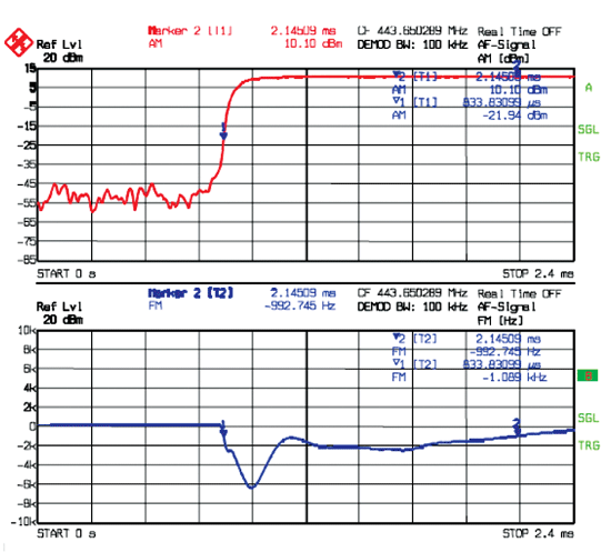 對于發射機和頻綜源來說,它們的幅度、頻率和相位瞬態特性是重要的測試指標。一般來說,頻率穩定時間是指發射機在輸出電平達到一定數值(通常為穩定輸出功率-30dB)開始,監測FM解調頻譜,直到頻率穩定到設計限值之內的這一段時間。