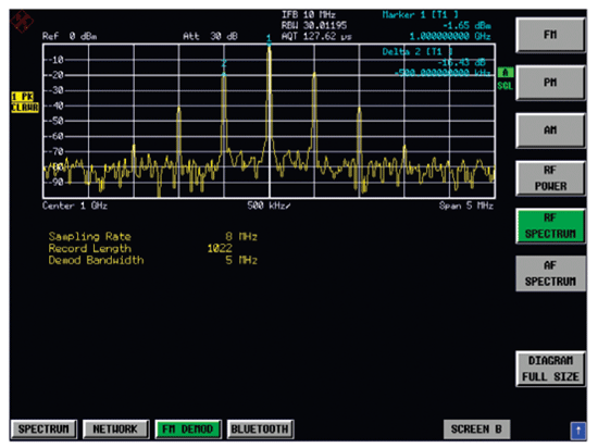 圖6是羅德與施瓦茨公司頻譜儀選件FS-K7在分析調頻信號的應用。它采用上述解調原理,可以實時解調調頻、調幅、調相和實時頻譜。