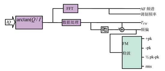 對此數組進行FFT計算,得到AF頻譜,其基波頻率即調制頻率fmod ,根據AF頻譜,可以計算調制諧波失真和信納比;