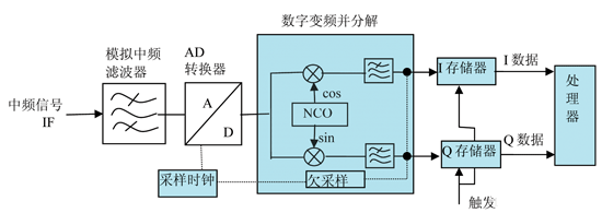 輸入頻譜儀的射頻信號經過混頻后變為中頻信號IF,再經過帶通濾波器(中頻濾波器)進入A/D轉換器。在數字處理部分,對下變頻為基帶的IQ信號進行低通濾波和欠采樣,存儲在內存中,準備進一步處理,存儲的數據表述IQ信號的電壓值。